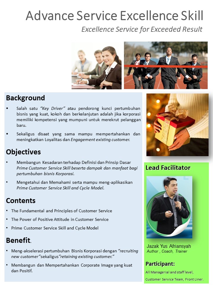 Advance Service Excellence Skill ini didesain untuk meng-akselerasi pertumbuhan Bisnis Korporasi dengan “recruiting new customer”sekaligus ”retaining existing customer.”
